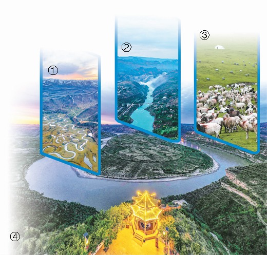图片说明:图①:四川省阿坝县曼扎塘湿地是黄河水系源头涵养地高原湿地,有十分丰富完整的高原湿地生态系统。刘国兴摄(人民视觉)图②:近年来,随着生态环境改善,青海省海东市化隆回族自治县境内的黄河两岸披上绿装。新华社记者 吴刚 摄 图③:甘肃省甘南藏族自治州是黄河重要水源补给生态功能区。近年来,甘肃通过实施水源涵养区保护、荒漠化治理、退耕还林等举措,使生态环境持续改善 新华社记者 吴刚 摄 图④:在陕西省延川县乾坤湾景区拍摄的夕阳下的黄河乾坤湾景色。薛俊 摄(人民视觉)
