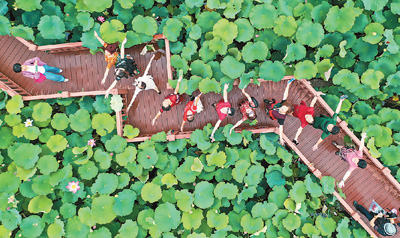 游客在浙江景宁云中大漈荷花塘赏花。李肃人摄(人民视觉)