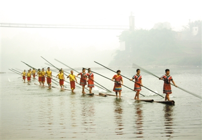 贵州赤水市转产渔民在赤水河上为游客表演“独竹漂”传统技艺。 梁小平摄