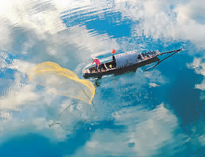 8月13日清晨,湖南省资兴市小东江上,一艘小船行驶在水质清澈的水面上,为游客展演“撒网捕鱼”。 郭立亮摄(人民视觉)