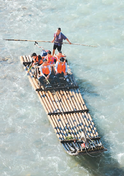 8月15日,游客在浙江温州永嘉楠溪江乘坐竹筏漂流。 王华斌摄(人民视觉)