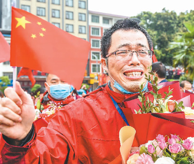 4月6日,湖南省永州市道县人民医院4名队员结束14天隔离休整后,与家人幸福团聚。图为受到夹道欢迎的周智热泪盈眶。 蒋克青摄(人民视觉)