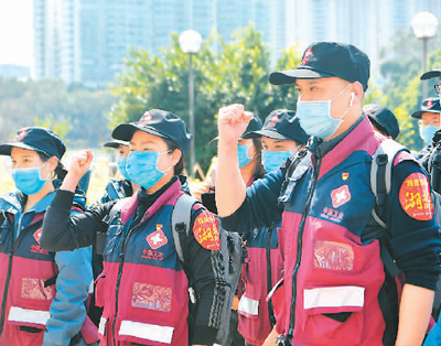 图为2月20日,福建省第十一批支援湖北抗击新冠肺炎疫情医疗队在出发前集体宣誓。 新华社记者 魏培全摄