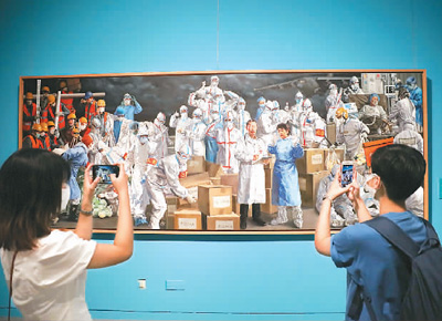 图为8月9日,观众在“众志成城——抗疫主题美术作品展”上用手机拍摄油画作品。该展自8月1日起在中国国家博物馆开展以来,每天都吸引众多的观众前来参观。 陈晓根摄(人民图片)