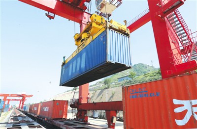 中哈(连云港)物流合作基地是江苏连云港自贸区港口区块里的一张亮丽名片。截至今年5月中旬,该基地今年到发中欧班列突破1万车。图为大型机械正在吊装集装箱。 王健民摄(人民视觉)