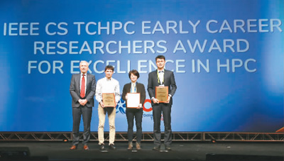 2018年,甘霖(右一)获国际电气和电子工程师协会“高性能专委会杰出新人奖”。 国家超级计算无锡中心供图