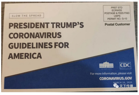 政府每天在开新闻发布会,通报疫情动态,告知注意事项。迄今我家收到唯一来自的政府关怀,就是白宫和CDC(疾控中心)联名寄来的明信片,纳税人邮资已付。上面写着“川普总统为美国防疫的指导纲领”。