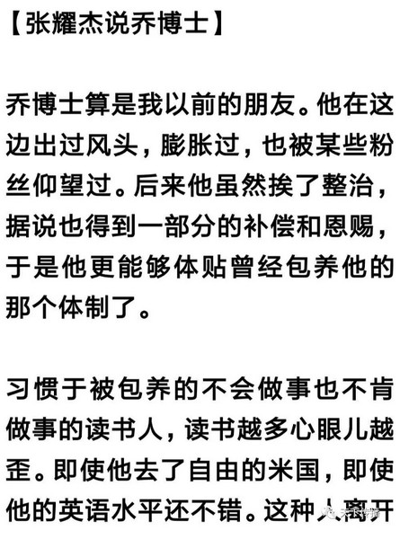张耀杰,文化部艺术研究院研究员,几年前行情看好的时候,出来干,成为文人傲骨。后来没了市场,悄没声息地又回去了,每月拿着两万元的扣缴前收入、医疗、养老、房补待遇,骂我被包养。