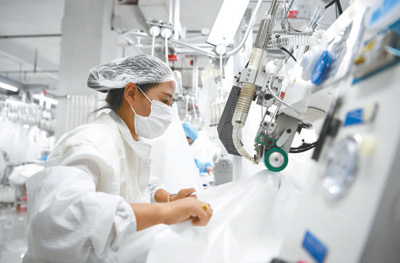 8月9日,甘肃省临夏回族自治州积石山保安族东乡族撒拉族自治县一家扶贫车间的员工在服装加工生产线上作业。 新华社记者 邢广利 摄