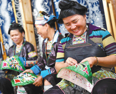 7月16日,在贵州省榕江县兴华乡摆贝苗寨,苗族妇女正在刺绣。近年来,摆贝苗寨在寨子里设置“扶贫车间”,组织苗族妇女生产制作苗族刺绣、蜡染等民族文化产品,在传承民族文化技艺的同时,增加了当地群众收入。王炳真 摄(影像中国)