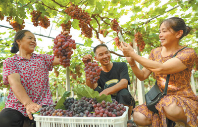 8月10日,四川省华蓥市的果农积极开拓线上销售渠道。图为果农正在拍摄丰收的葡萄。邱海鹰 摄(影像中国)