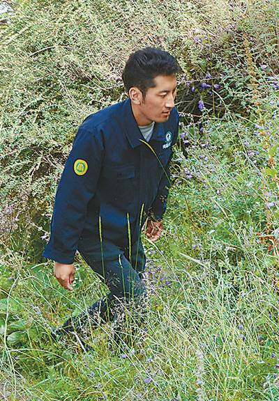 卡日土保已经工作9年了。“喏!这就是我负责的地方。”搭上卡日土保的摩托,记者来到了他负责巡护的区域——麦浪沟。阳光透过高耸的云杉洒下来,林中传来阵阵鸟鸣。没走几步,人就喘不上气来。抬头一看,卡日土保却已经在高处,正给一棵圆柏“体检”。