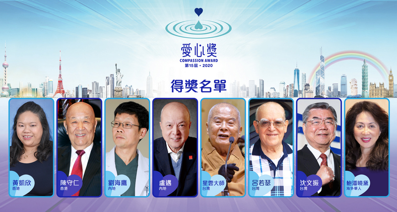 由港澳台灣慈善基金會主辦、鳳凰衛視協辦及製作播出、北京東西方慈善論壇及台灣現代財經基金會協辦的第15屆‧2020「愛心獎」,今天(8月26日)揭曉8位得獎人,包括內地的盧邁、劉海鷹;台灣地區的星雲大師、呂若瑟、沈文振;香港地區的陳守仁、黃凱欣;海外地區的鮑潘曉黛,他/她們在慈善界展現卓越的領導能力、堅持不懈的愛心事蹟,是人間典範,每位同時獲頒15萬美元獎金。本屆頒獎典禮預定12月中旬在香港舉行。