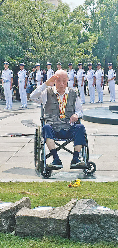 9月3日,上海淞沪抗战纪念馆胜利广场,一名抗战老兵向烈士致敬。 本报记者 沈文敏摄