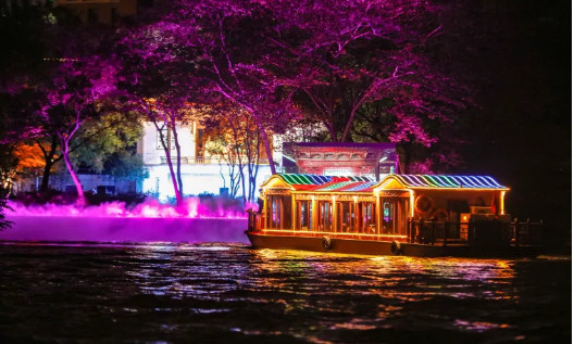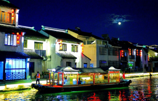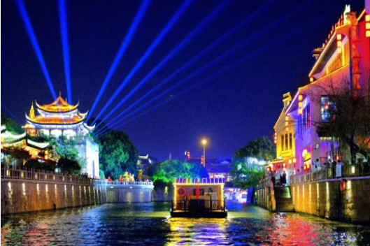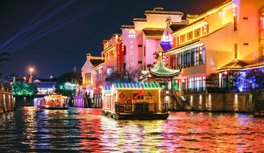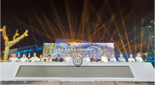 开幕式前,中外嘉宾乘坐江南画舫夜游运河,欣赏古运河秀美多姿的夜色美景,观看运河两岸缤纷多彩的实景演出。