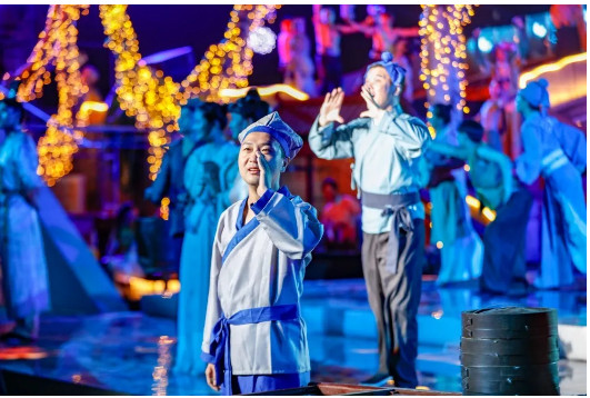 搭建由水岸、桥头、游船组成的立体多维度表演舞台——“春波绿韵” “夏岸浓荫” “秋渡金风” “冬湾雪景”,以歌、舞、诗、乐、曲艺、戏曲等艺术形式,以四季节令与色彩的自然变化形象展示大运河全流域的景色之美、人文之美、风物之美。