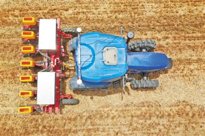 在河南省邓州市小杨营镇安众村,加装有北斗导航系统的拖拉机在无人驾驶状态下播种。 新华社记者 冯大鹏摄
