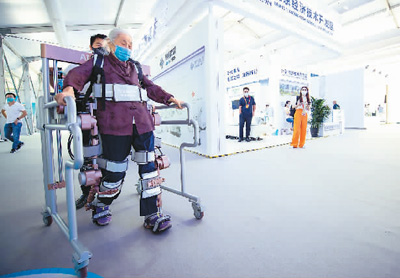 一位老人在服务机器人专题展区体验外骨骼康复训练机器人。 新华社记者 陈钟昊摄