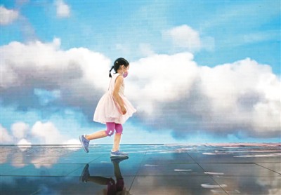 在旅游服务专题展区内的世界旅游城市联合会展台,一名儿童走过播放着旅游宣传片的大屏幕。该展台设有墙面和地面两块超大屏幕,循环播放着多个旅游宣传片,站在屏幕上仿佛置身于美景之中。 新华社记者 才 扬摄
