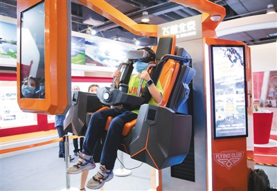 一名小朋友在旅游服务专题展区使用沉浸式VR体验终端,体验“飞越北京”娱乐项目。 新华社记者 潘思危摄