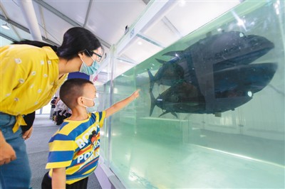 在机器人服务展区,一对母子正在参观多关节仿生机器鱼。 翁奇羽摄(人民图片)