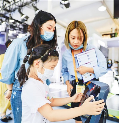 9月7日,孩子们在服贸会上被中车长春设计的地铁列车吸引。 陈晓根摄(人民视觉)