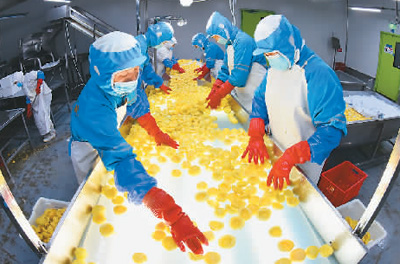 位于江苏连云港经济技术开发区的江苏雅仕保鲜产业有限公司,工人正在将一批鲜桃加工成速冻桃丁。 耿玉和摄(人民视觉)