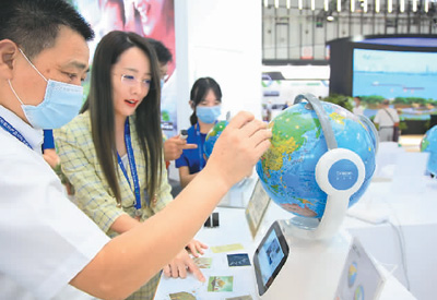 9月6日,江苏省南京市,人们在体验一款“AR智能学习地球仪”产品。 刘建华摄(人民视觉)