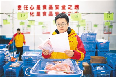 陕西黄马甲物流配送股份有限公司生鲜中央工厂的工作人员认真核对供应链产品。 马 壮摄