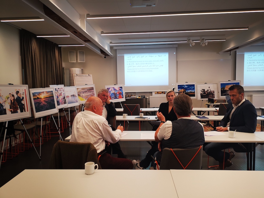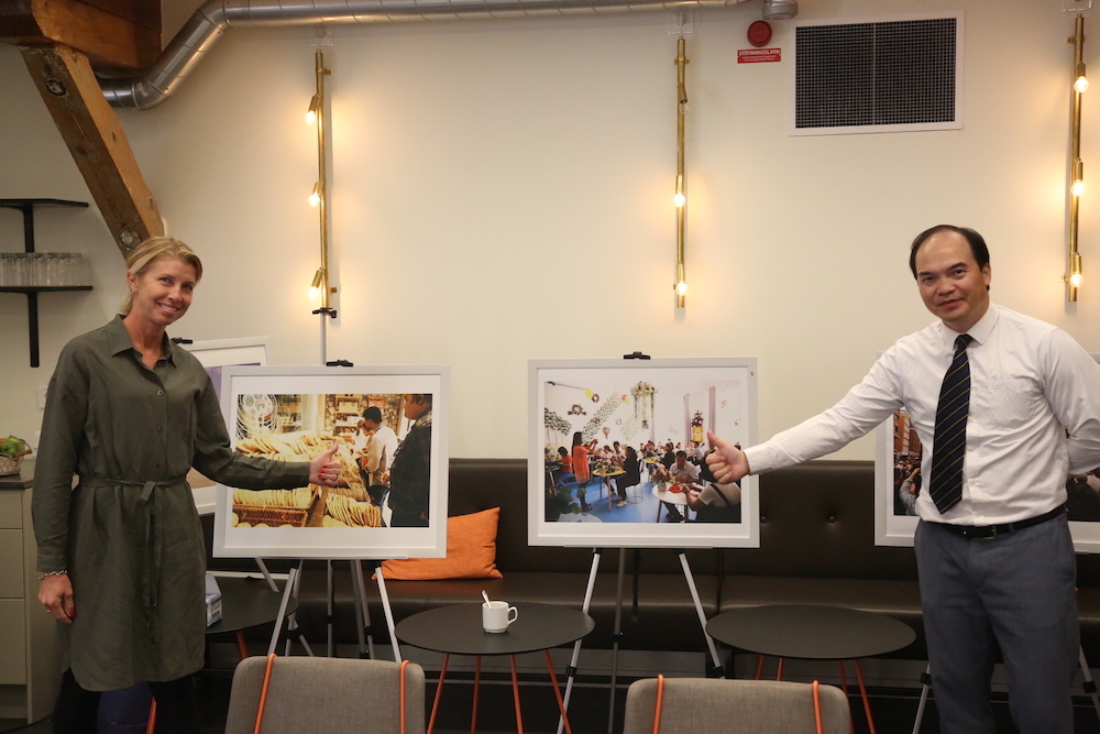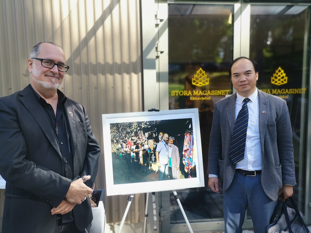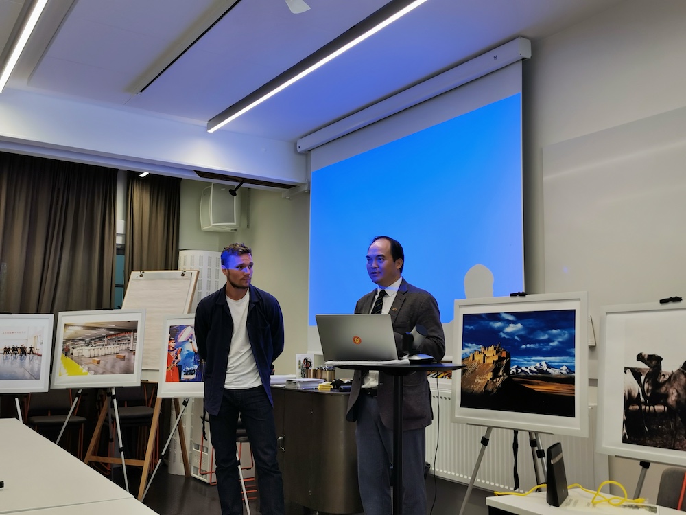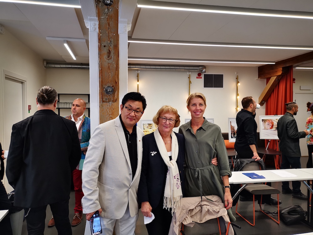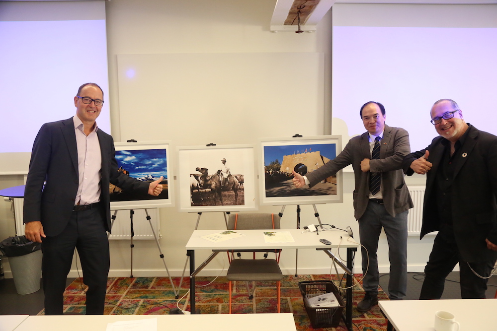瑞典乌普萨拉市政府副市长斯蒂芬、北欧时报社长何儒、瑞典艺术家安德斯为新疆图片展点赞/北欧时报 Fliex
