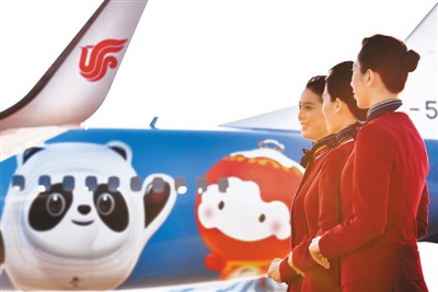 空乘人员在“冬奥冰雪号”彩绘飞机亮相活动现场。