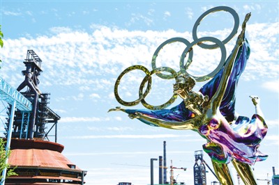 在蓝天白云掩映下的北京市首钢园里,雕塑作品《冬奥之约》与首钢工业遗迹遥相呼应。