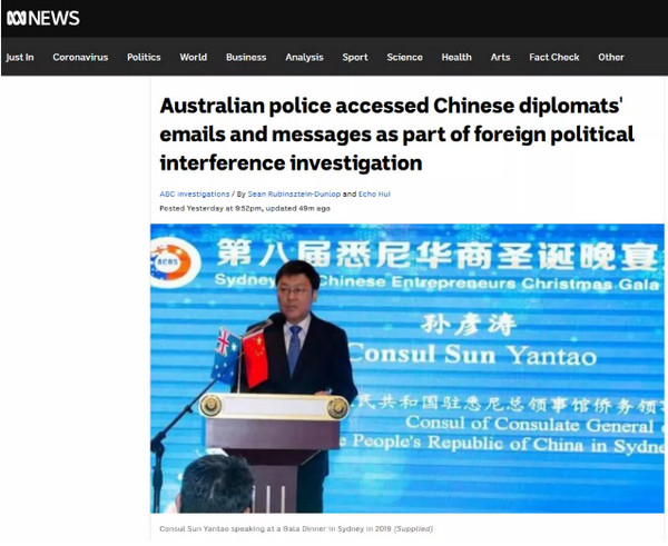 根据澳大利亚广播公司调查记者Sean Rubinsztein-Dunlop和Echo Hui报道说,澳大利亚联邦警察没收了中国驻澳外交官的通信记录,而这一做法可能违反了国际法和澳大利亚法律。