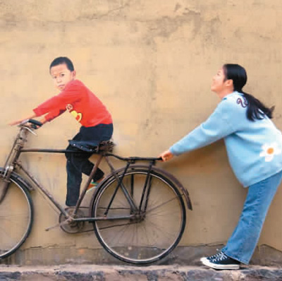 游客与创意壁画《骑单车的二猛》合影留念。 五合乡文化站供图