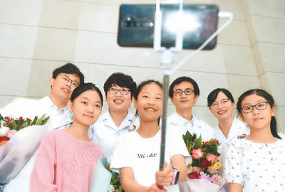 近日,河北沧州实验小学六年级八班的几位学生与沧州市人民医院抗击新冠肺炎疫情模范代表自拍合影。 傅新春摄(人民视觉)