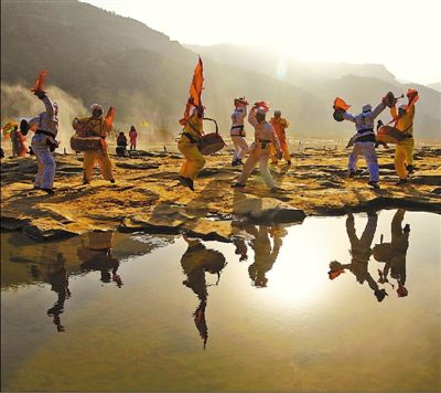 陕西省延安市宜川县壶口乡村民在壶口瀑布景区内表演祖辈流传下来的壶口斗鼓。 郭景阳摄(人民视觉)