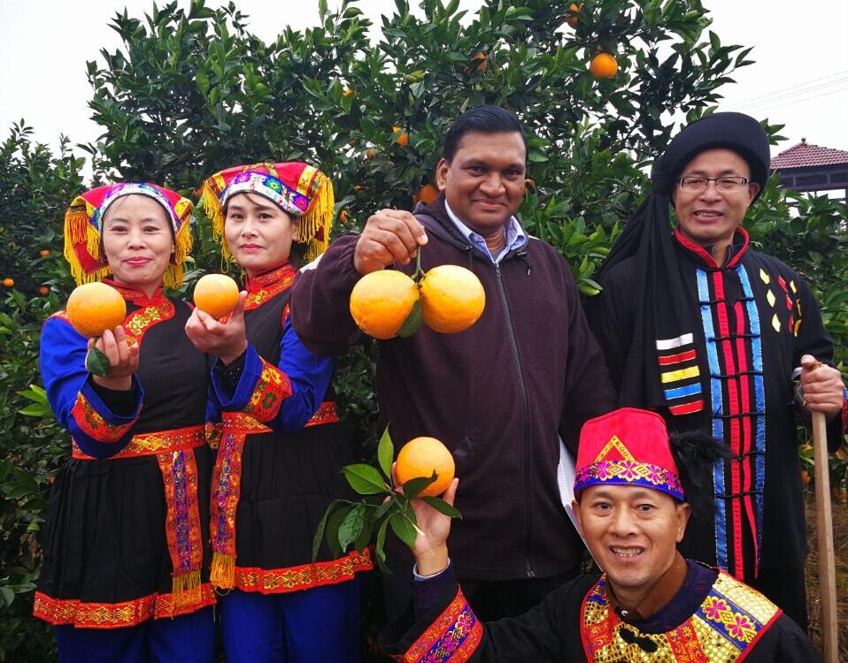 东盟客商与身着盛装开园采摘崀山脐橙的瑶家同胞合影 张新 摄影