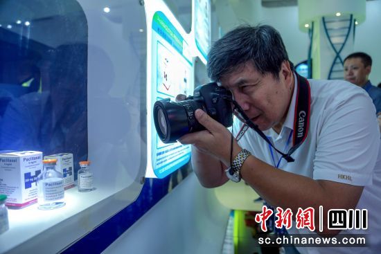 一位海外华文媒体代表在四川汇宇制药股份有限公司拍摄所产的抗癌药。王磊 摄