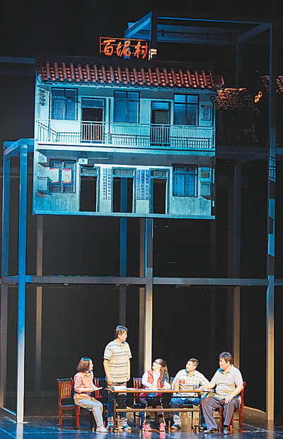 开场纱幕多媒体投影,用变化的等高线来抽象地表现广西的山水。等高线缓缓移动变化,那原本让人向往的青山,仿佛成了走不出的贫困迷宫。由于是框架的舞美结构,纱幕升起之后的舞台画面被自然切割成方块,为各时空灵活切换、移步换景打下基础。实际演出过程中,舞台的上中下三层、前中后三层、左中右三层均被打通,空间组合的使用非常丰富。