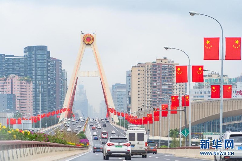 9月26日,成都市天府立交桥上挂满国旗,迎接国庆节的到来。 新华社发(张可凡摄)