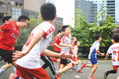 在四川成都石室小学,学生和家长一起在足球课上做游戏。 新华社记者 唐文豪摄