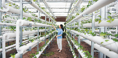 在山东省日照市东港区龙门崮田园综合体“智慧农业园”,工人正查看无土栽培的农作物。 房德华摄(人民图片)