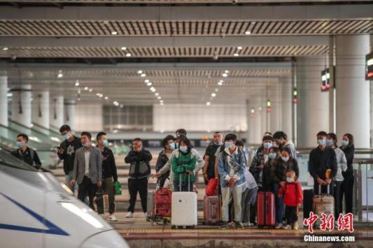 9月30日,旅客在贵阳北站站台候车。当日是国庆中秋假期前一天,全国铁路迎来出行客流高峰。 中新社记者 瞿宏伦 摄