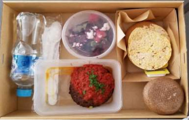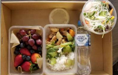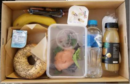 一日三餐饭食被装在一个盒子里放在托盘上。为了避免人员接触,要等工作人员敲门通知十