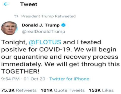 冠检测阳性!特朗普第一时间在自己推特上发布了这个消息: