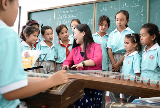 文化志愿者刘倩在阿拉尔市托喀依乡学校为留守儿童传授古筝演奏知识——王志清