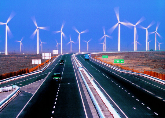 兵团大力发展风力发电、风电设备及其配套产品,图为与国电合资建设的阿拉山口风电场