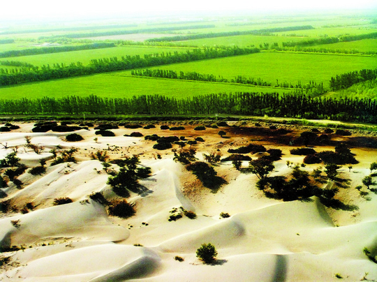 地处沙漠边缘的兵团团场在沙漠里建设固沙防风林体系