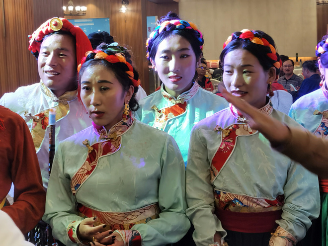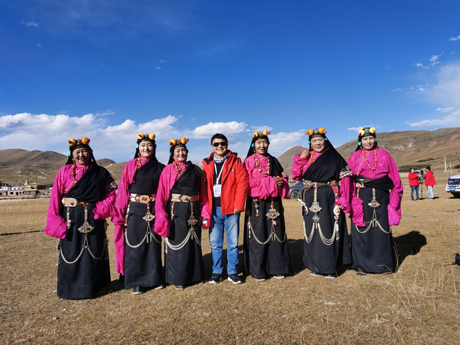 10月17日下午,中外媒体记者们在囊谦采访国家非遗舞蹈卓根玛、乐器牛角胡演绎