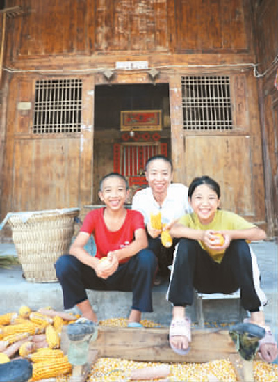 在贵州省余庆县红渡村,村民余勇的孩子在学习之余帮助家里做农活。 海外网 谢 明摄
